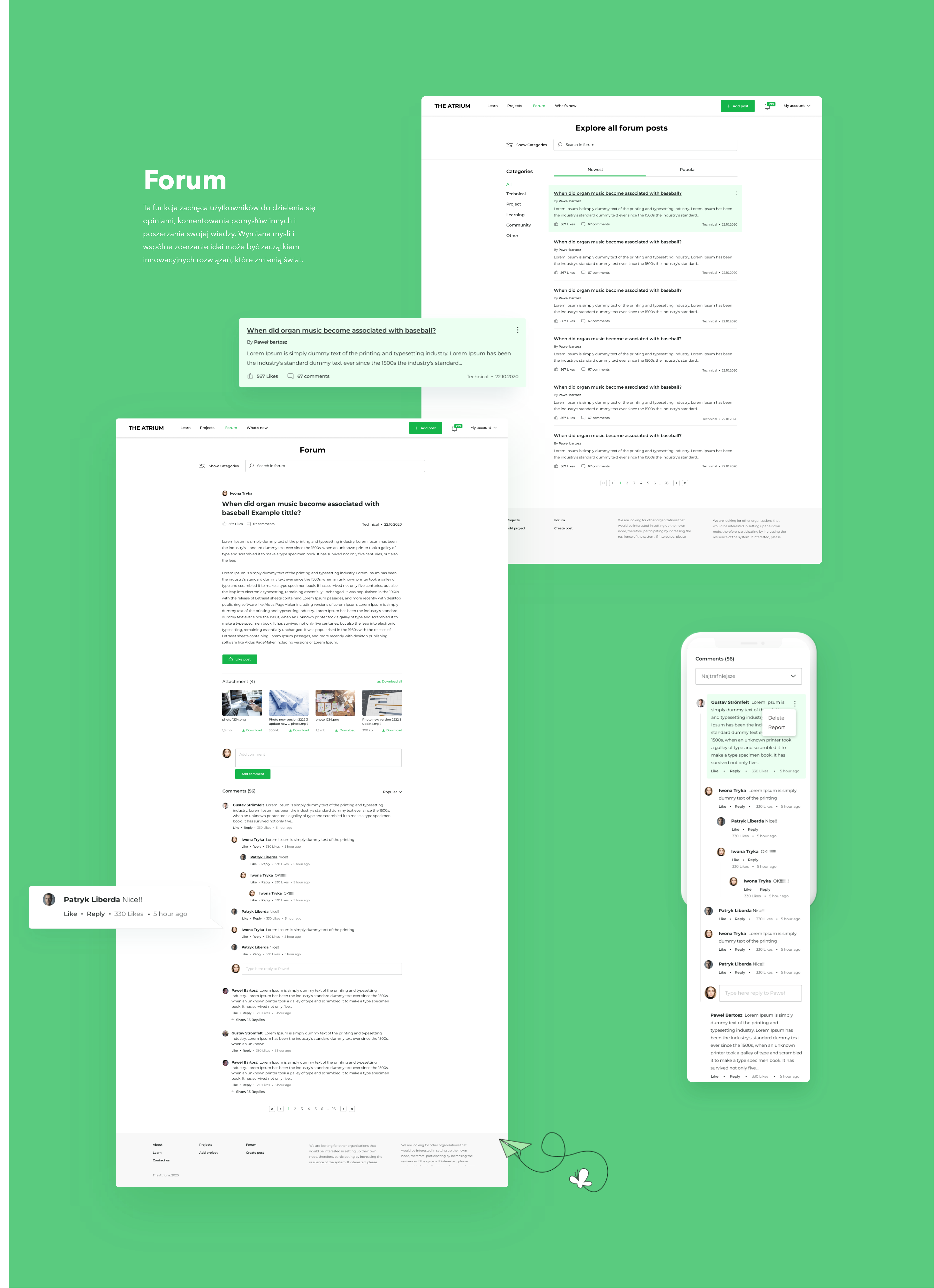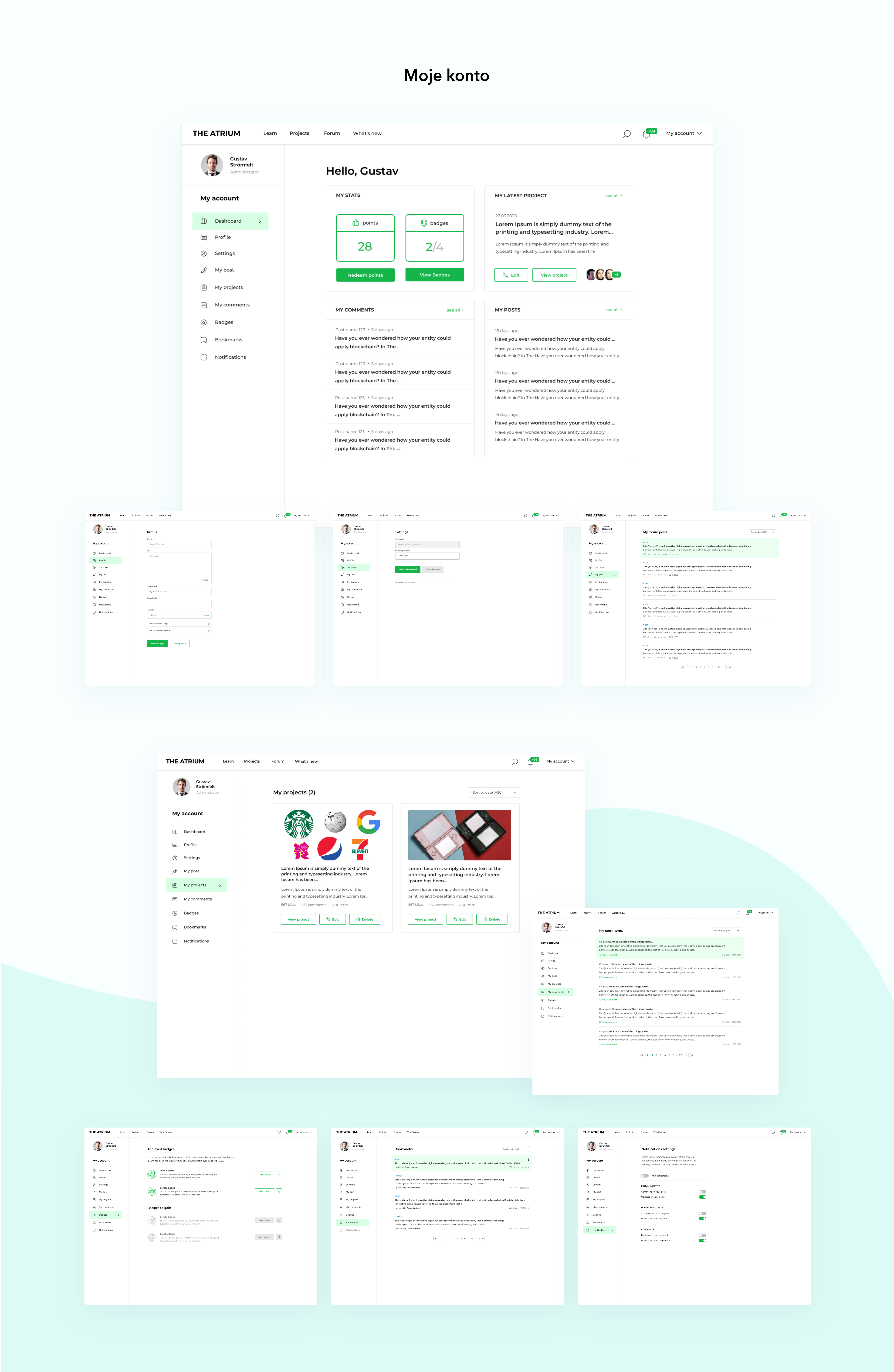 Nasza ciężka praca przy opracowywaniu koncepcji i projektowaniu zupełnie nowej wersji platformy dla The Atrium zakończyła się sukcesem. System przede wszystkim wspiera wśród swoich funkcji uczenie się i interakcję, opierając się na intuicyjnych i klarownych rozwiązaniach UX, które zachęcają do wzajemnych informacji zwrotnych i współpracy. Kiedy użytkownicy po raz pierwszy odwiedzają platformę, są proszeni o utworzenie konta, które sprawia, że nawigacja po systemie jest płynna. Mogą również zdobywać punkty i odznaki, komentując prace innych użytkowników, co dodatkowo wzmacnia ducha pracy zespołowej.