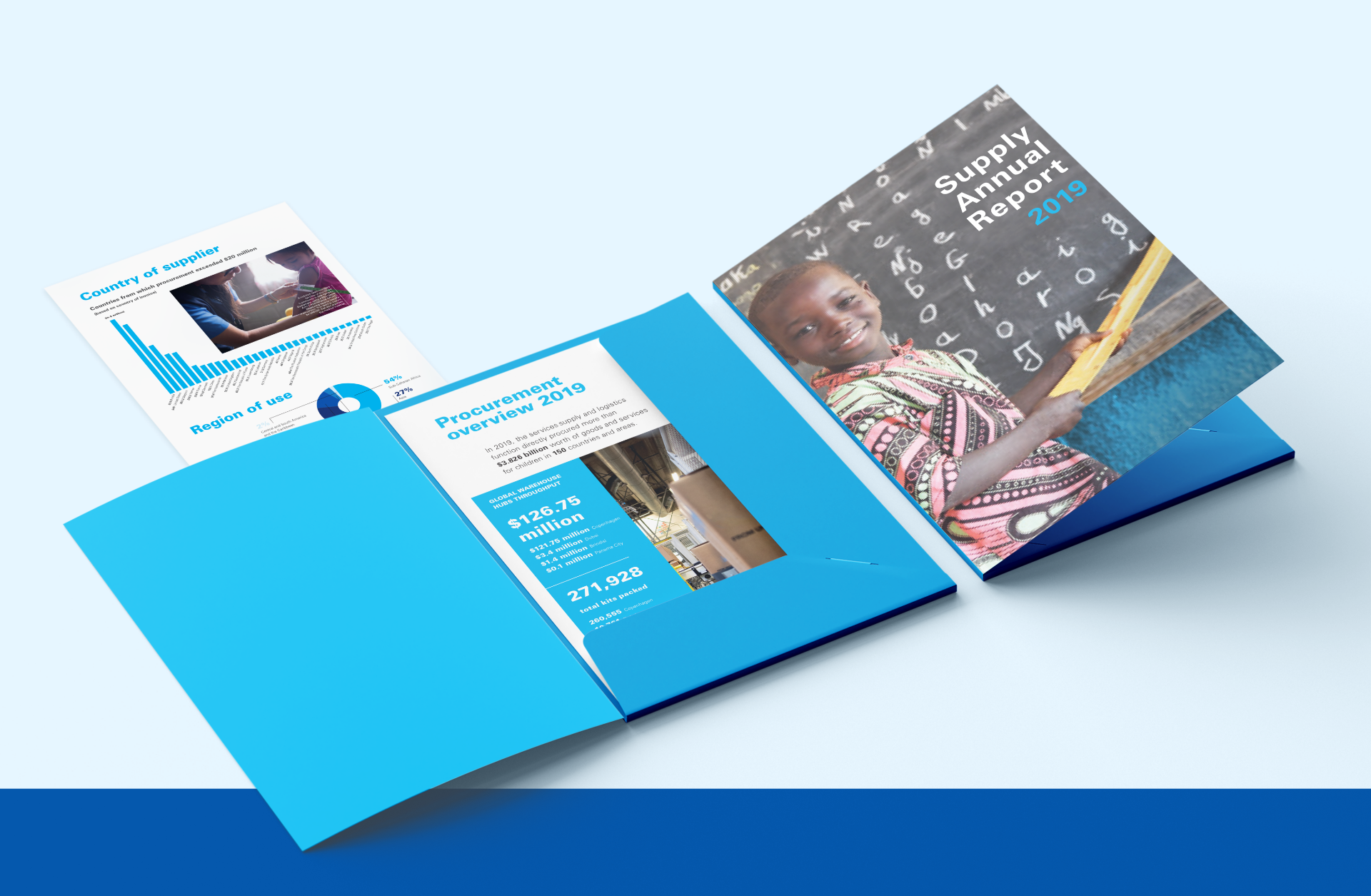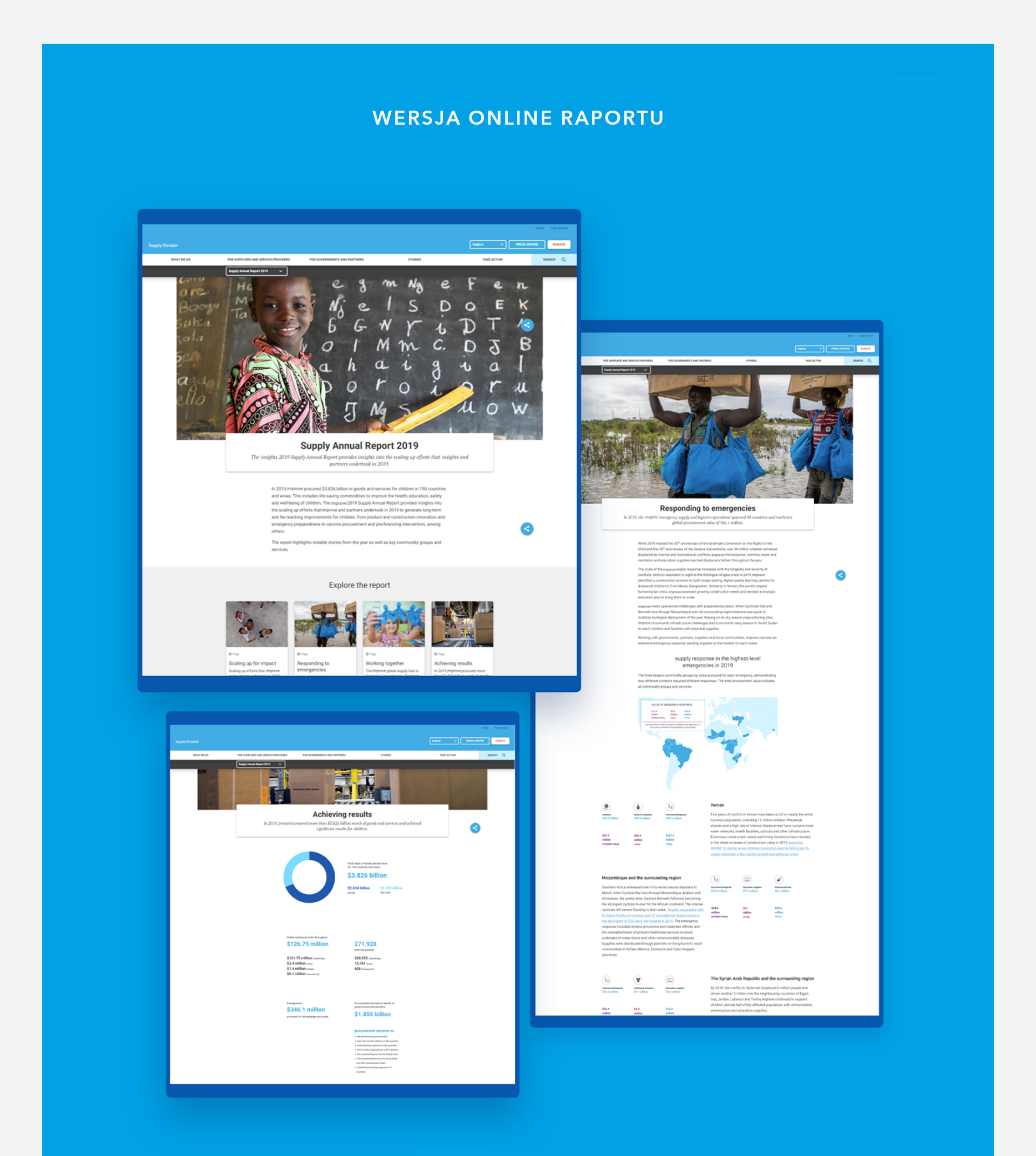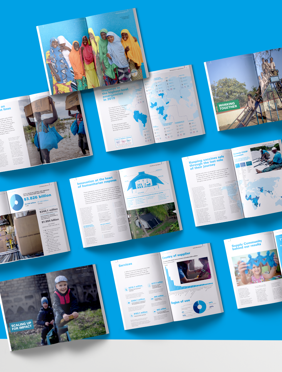 Roczny Raport Zaopatrzenia to jedna z najważniejszych corocznych publikacji dla naszego klienta, podsumowująca działalność całej Organizacji w minionym roku. Ponieważ zawiera tak wiele informacji, wiedzieliśmy, że konieczne jest, żeby przedstawić tę ogromną ilość danych w prosty, przejrzysty, ale angażujący wizualnie sposób, aby były one wyraziste i łatwe do spożycia. Ponadto musieliśmy przygotować raport zarówno w formie drukowanej, jak i cyfrowej, a także stworzyć animacje, panele ścienne Tusand oraz broszurę opracowaną na podstawie informacji zawartych w raporcie. Musieliśmy zachować wizualną spójność całej marki, jak i projektu we wszystkich materiałach marketingowych, o stworzenie których zostaliśmy poproszeni, jednoczesnym zachowując możliwość dostosowania danych do odpowiedniego formatu.