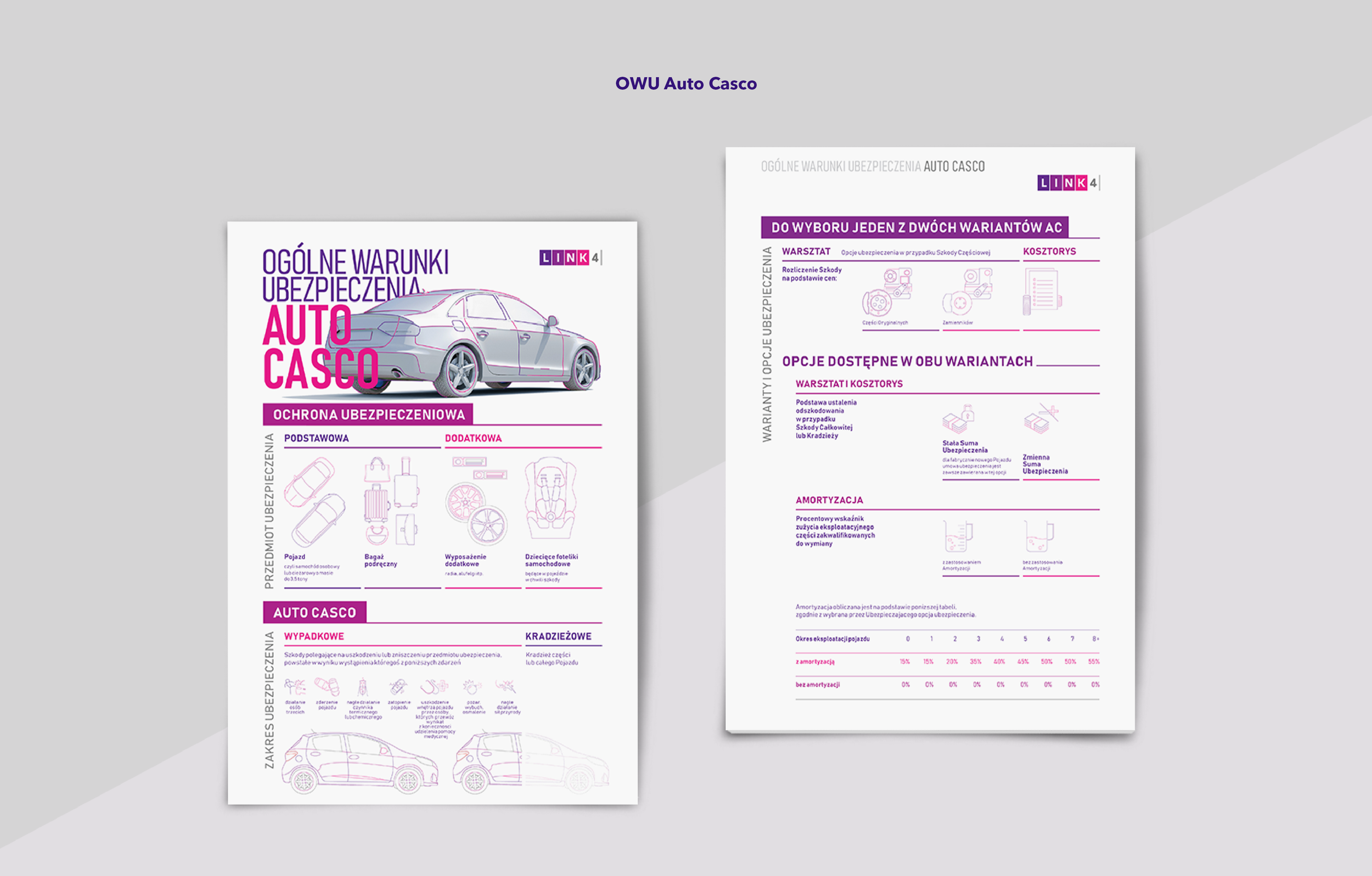 Główną częścią naszej pracy było stworzenie koncepcji wizualnych i graficznych wyjaśniających OWU – Ogólne Warunki Ubezpieczenia – różnych planów ubezpieczeniowych oferowanych przez LINK4. OWU zawiera wysoce techniczne i szczegółowe informacje. Dokładnie przeanalizowaliśmy konkurencję i standardy branżowe, aby określić główne potrzeby klientów, najważniejsze elementy konieczne do podkreślenia i wybraliśmy kierunki, które wyróżniają markę na rynku. Świadomi, że grupy docelowe usług ubezpieczeniowych są bardzo zróżnicowane, skupiliśmy się na zaprojektowaniu przekazu, który będzie jasny i zrozumiały dla każdego kupującego ubezpieczenie. Zmaksymalizowaliśmy nasze starania, aby pomóc marce dotrzeć do jeszcze większej liczby osób i zwiększyć rozpoznawalność marki.