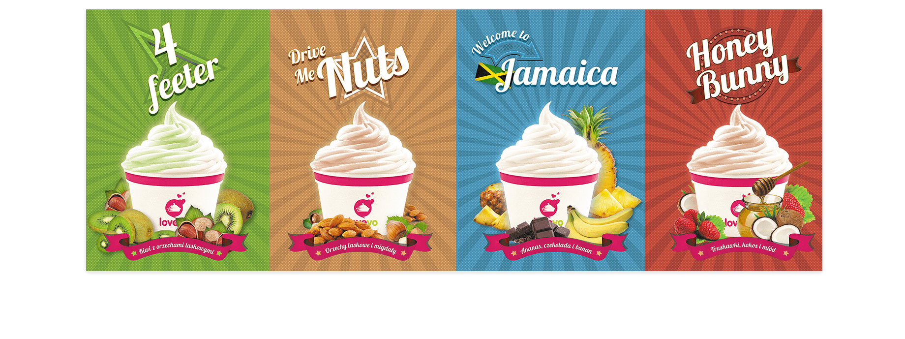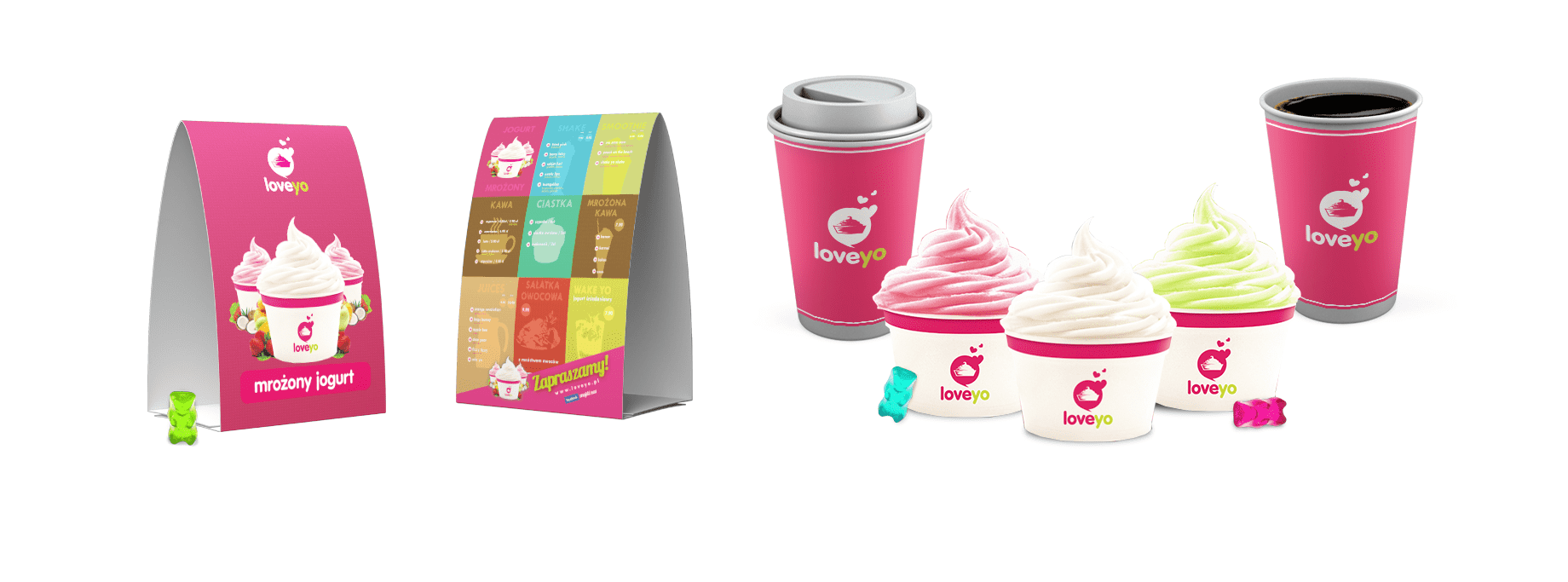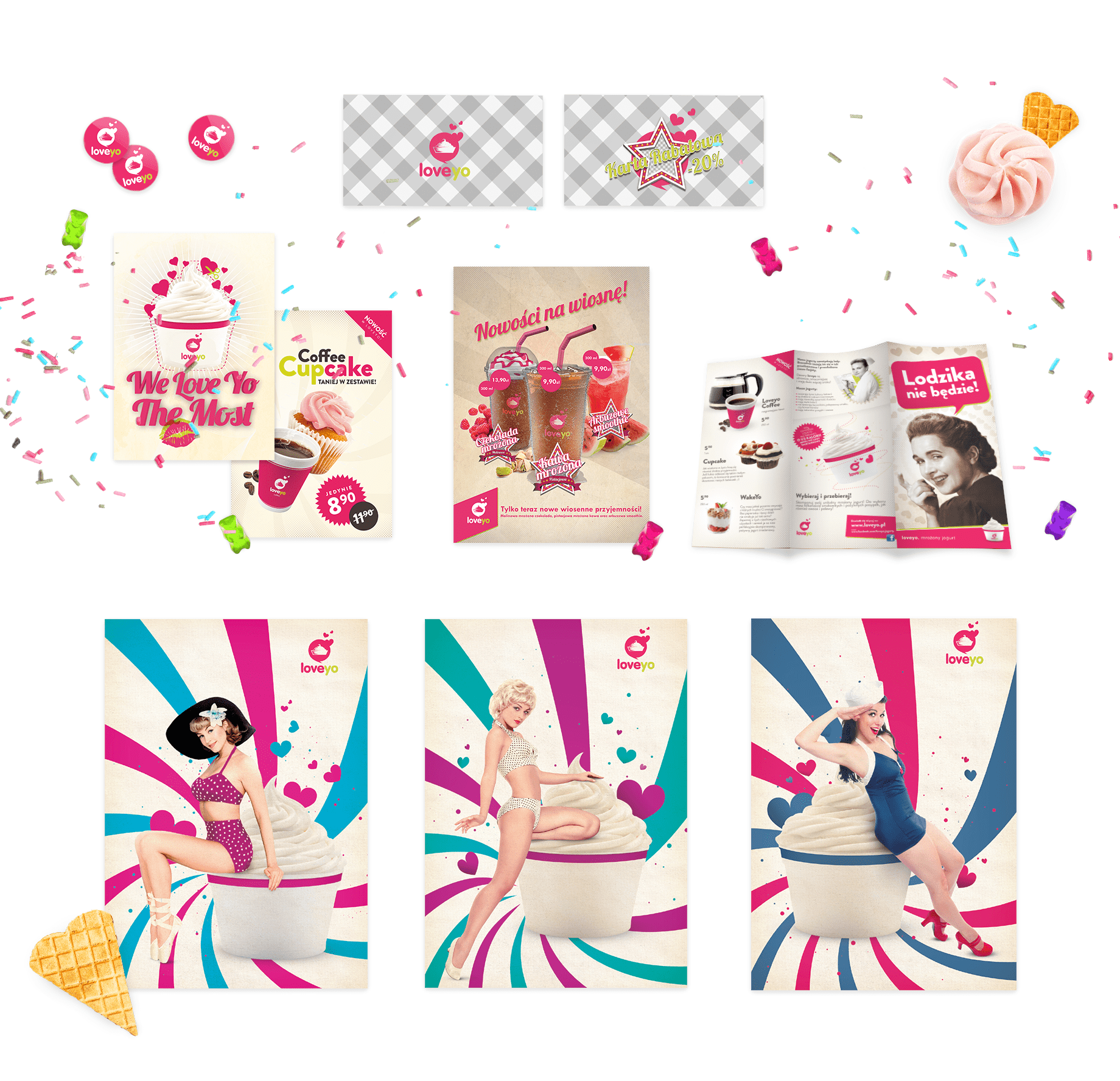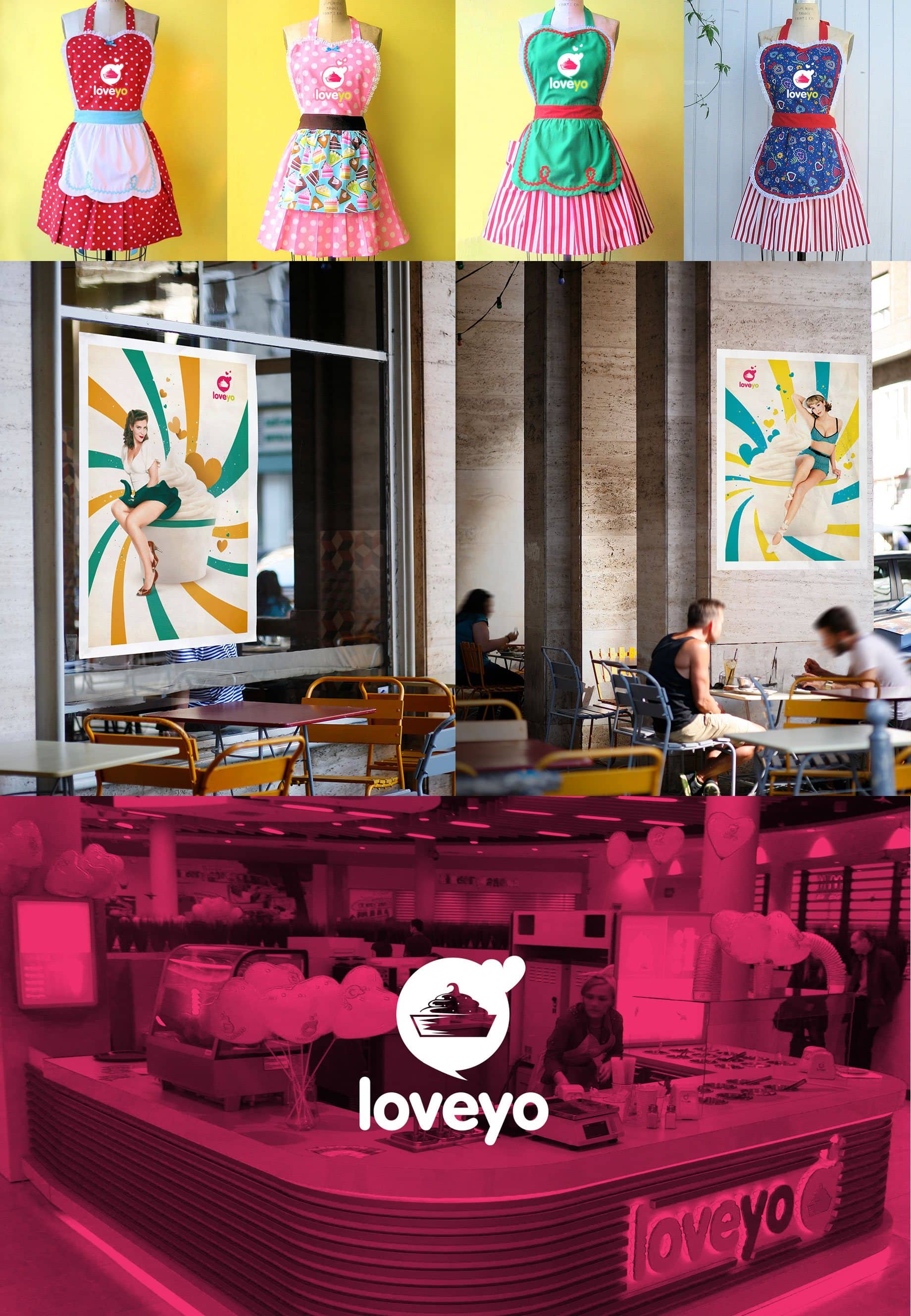 LoveYo to nowoczesna marka oferująca mrożone jogurty i desery, która nawiązuje stylistyką do szalonych lat 50. W procesie tworzenia jej wizerunku staraliśmy się w kreatywny sposób podejść do stylistyki tego okresu. Inspiracją dla naszych działań był okres Streamline Moderne oraz trendy pin-up.