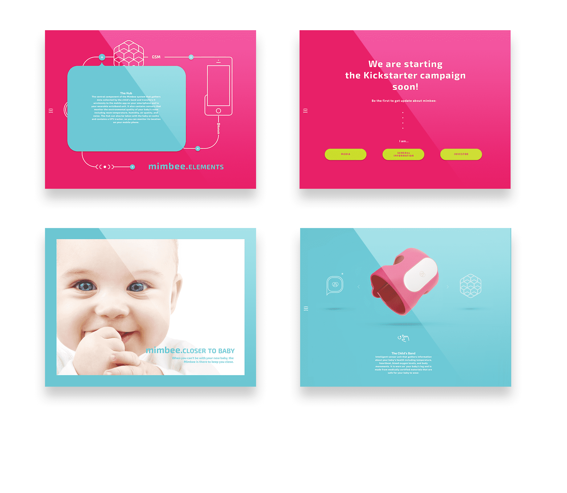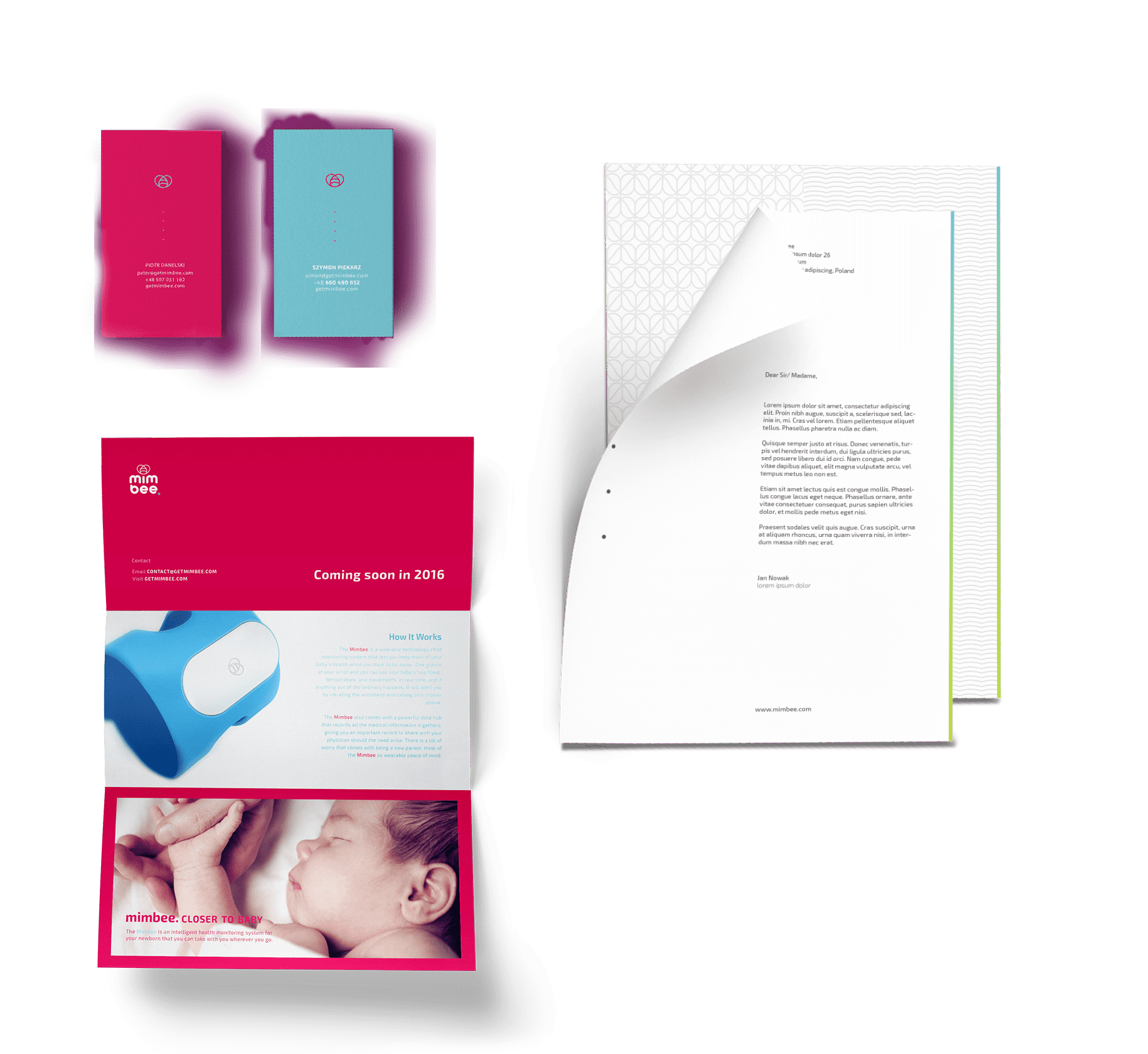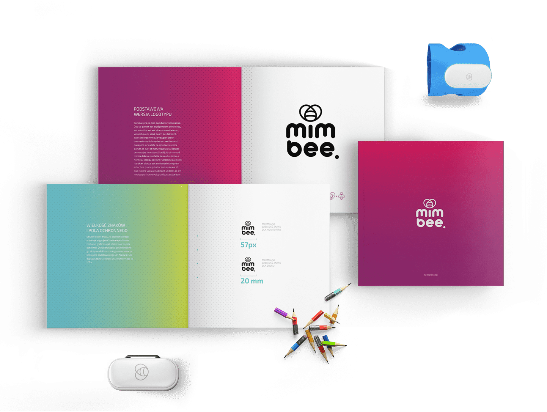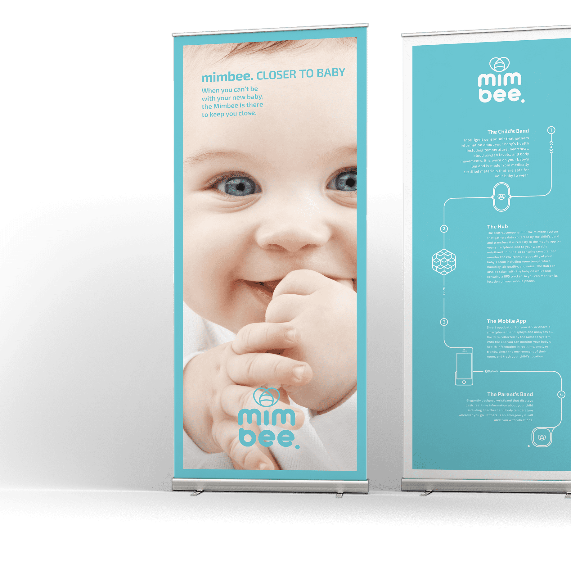 Dla produktu stworzona została identyfikacja marki mająca w jak najlepszy sposób pokazać właściwości Mimbee podczas kampanii Kickstarter. Zastosowano, charakterystyczne dla produktów i usług z sektora Baby & Parenting, żywe, intensywne kolory. Tworząc logotyp, połączono występujący w nazwie graficzny wizerunek pszczoły ze znakiem serca oraz dłoni symbolizujących bliskość i bezpieczeństwo.
