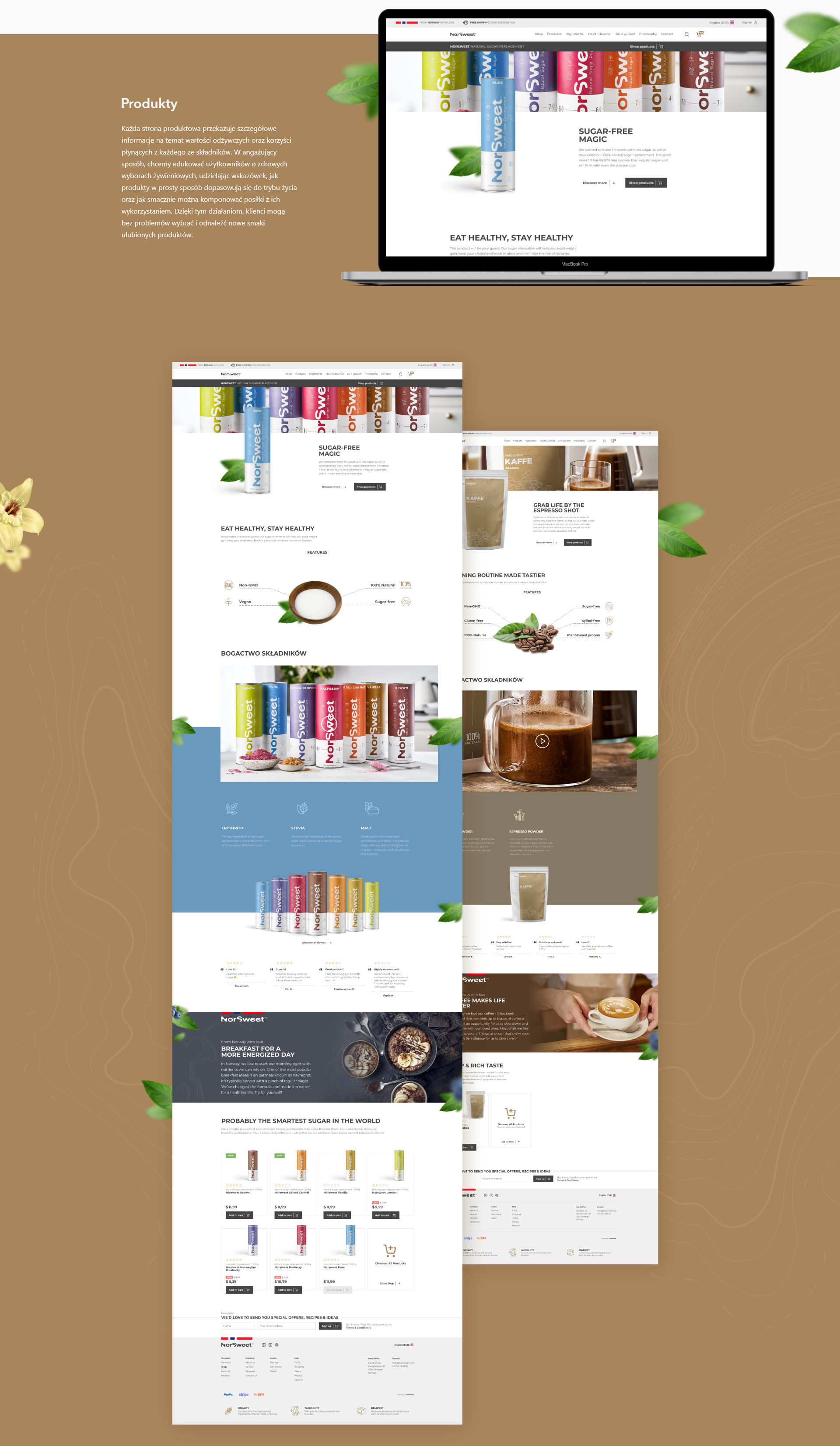 Stworzyliśmy ton i głos unikalne dla NorSweet, które nie tylko brzmią autentycznie i naturalne, ale także są angażujące i edukacyjne. Zebraliśmy zespół wspaniałych copywriterów i wdrożyliśmy nasz koncept krok po kroku – od tekstów produktowych i sprzedażowych, poprzez stronę internetową oraz materiały drukowane (m.in. ulotki, katalogi, broszury), po elementy współpracy z influencerami, reklamy i treści w mediach społecznościowych.