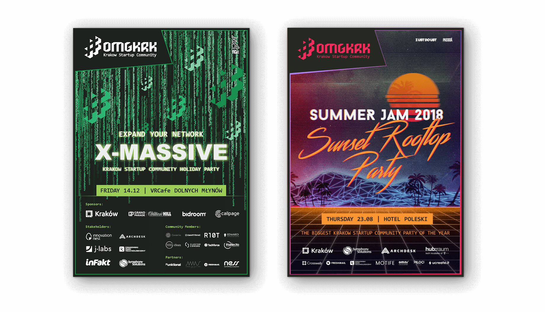 Społeczność #OMGKRK skupia się wokół eventów. Ich oprawa wizualna musi oddawać energiczność, dynamikę i nowoczesny charakter branży startupowej.