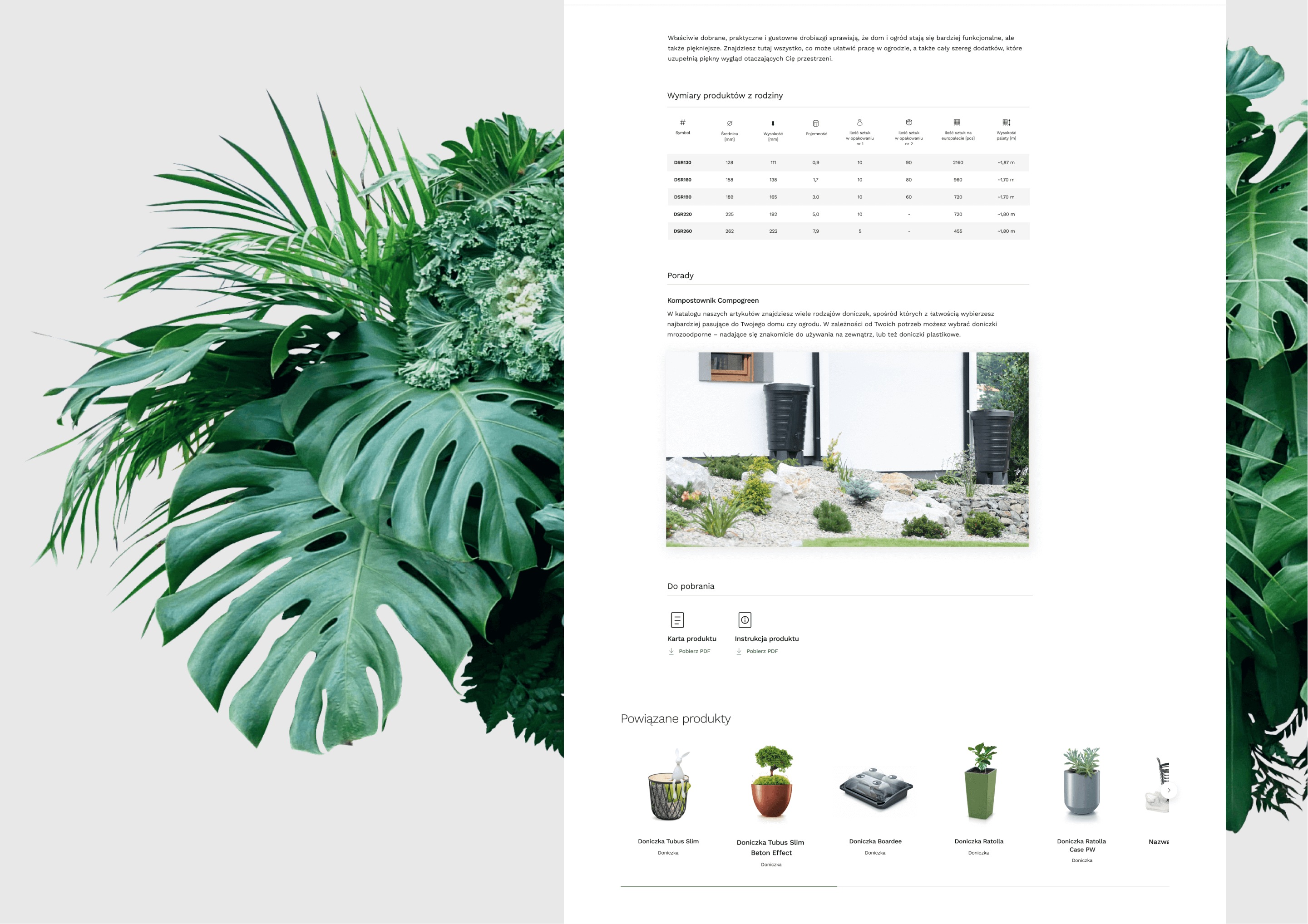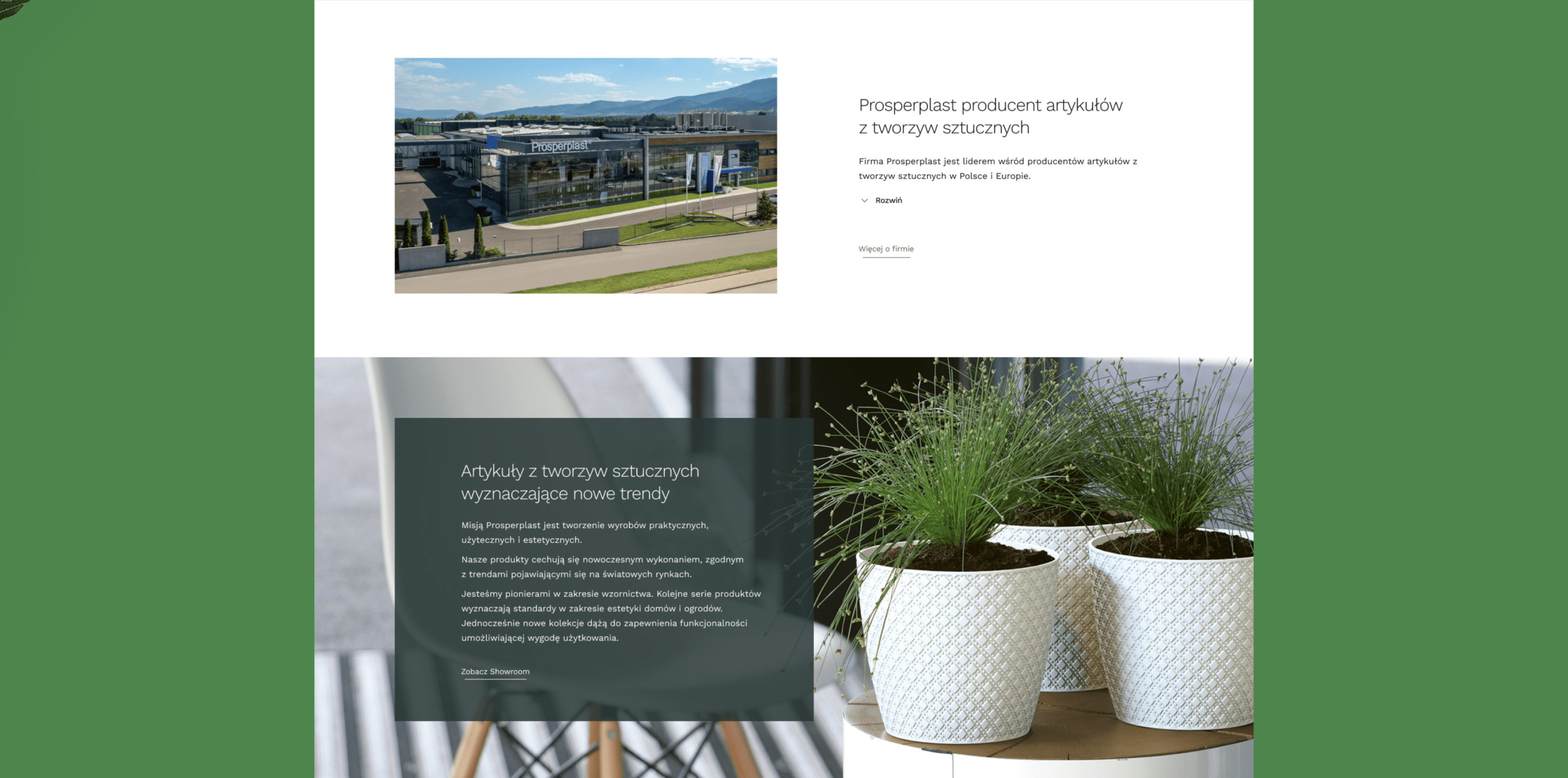 Misją Prosperplast jest tworzenie wyrobów pięknych i użytecznych, a także wyznaczanie standardów w zakresie estetyki domów i ogrodów. Aby to podkreślić, stworzyliśmy dedykowane zakładki, w których klienci znajdą szeroką gamę porad oraz inspiracji. Wartość estetyczną strony podniosły autorskie zdjęcia lifestyle’owe, dzięki którym klient może wyobrazić sobie produkty w swojej przestrzeni ekspozycyjnej, sklepowej lub domowej.