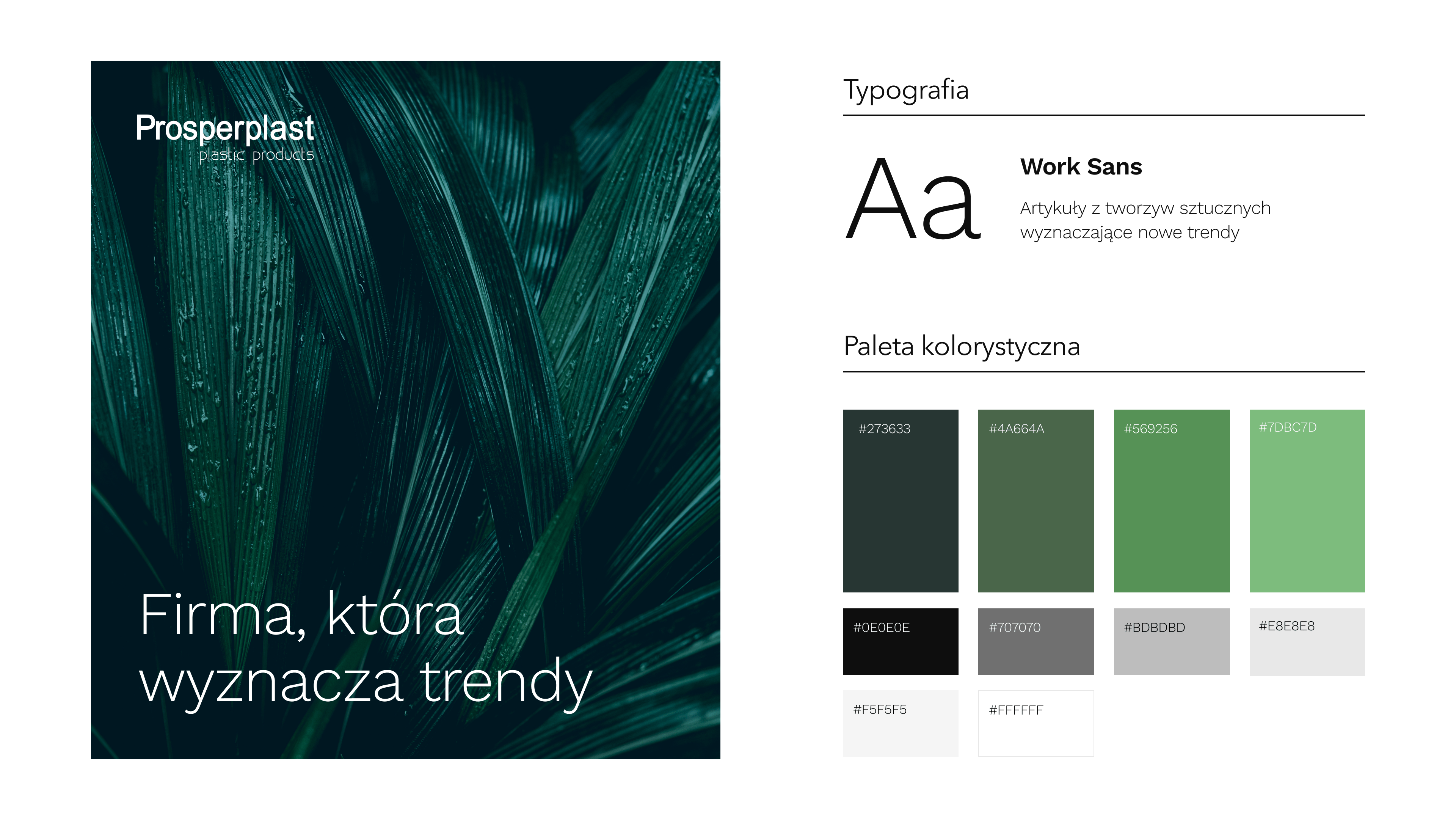 Prosperplast podejmuje działania proekologiczne – stosuje tworzywa z recyklingu, oferuje szeroką gamę ekologicznych produktów, a także planuje transport tak, aby zminimalizować emisję spalin. Aby podkreślić troskę o środowisko naturalne, postawiliśmy na botaniczny motyw przewodni – makro zdjęcia liści oraz odcienie stonowanej zieleni, które utrwalają w podświadomości użytkowników fakt, że firma tworzy produkty przyjazne środowisku.