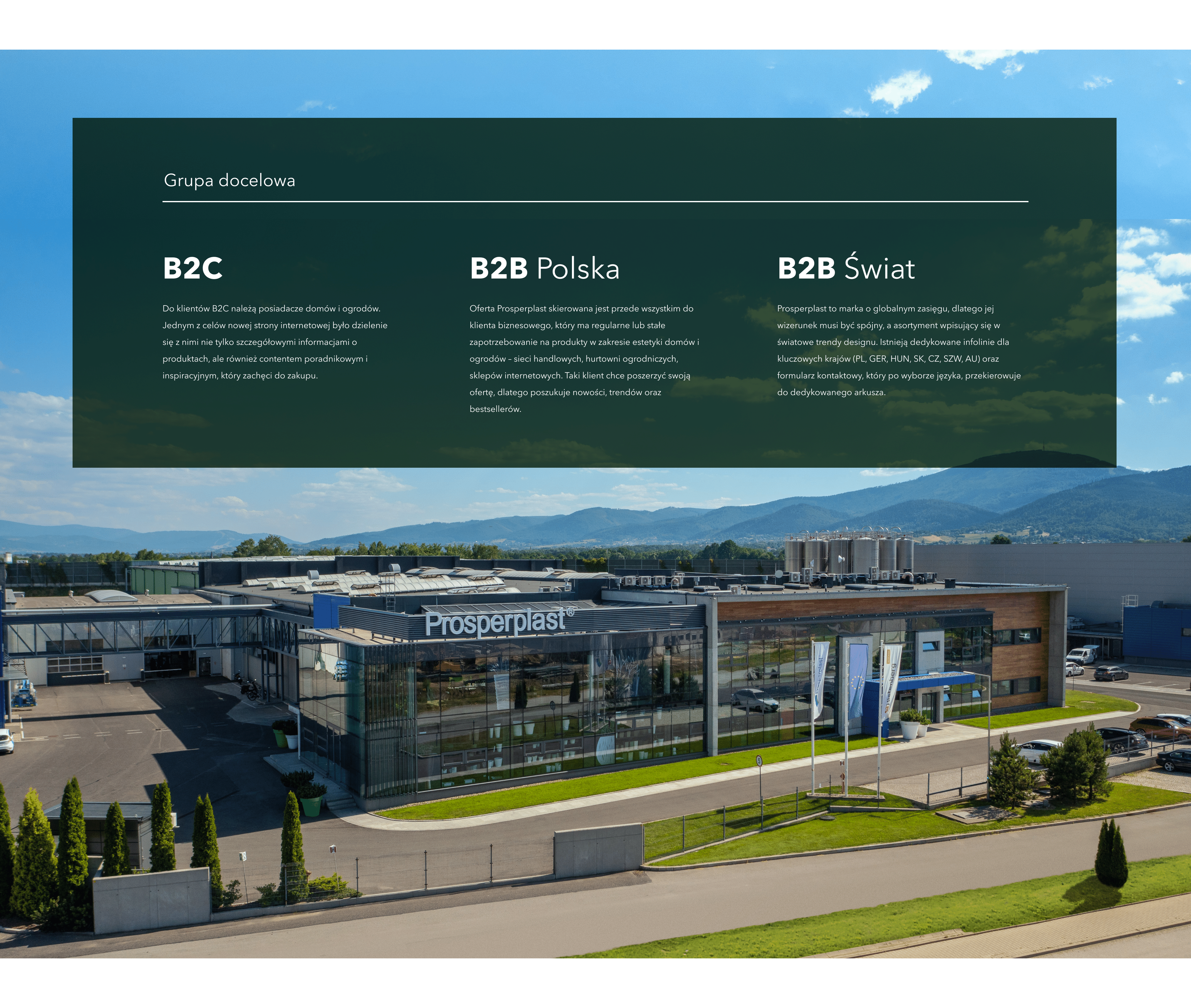 Stanęliśmy przed wyzwaniem zaprojektowania nowoczesnej strony www, która miała w estetyczny sposób eksponować produkty, wzmacniać globalny wizerunek marki, odpowiadać na potrzeby klientów B2B oraz B2C, a w przyszłości zostać przekształcona w e-commerce. Nowa strona miała mieć także wartość edukacyjną i inspiracyjną, by być wsparciem dla klientów B2B, którzy sprzedają dalej produkty Prosperplast klientom indywidualnym.