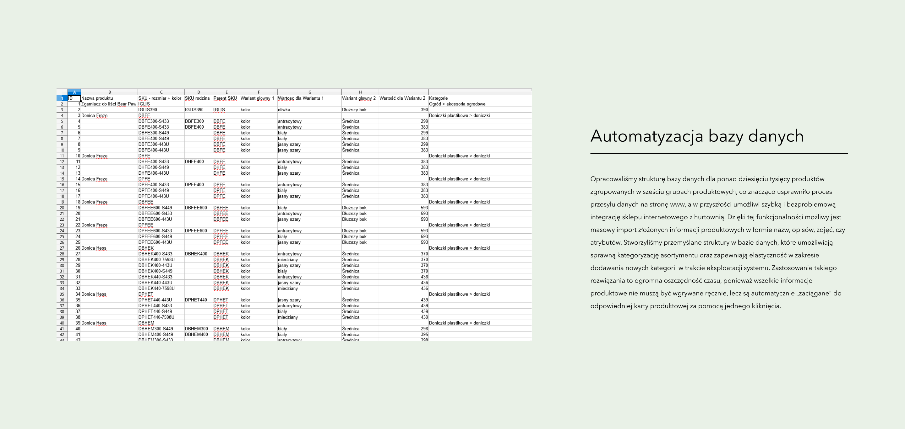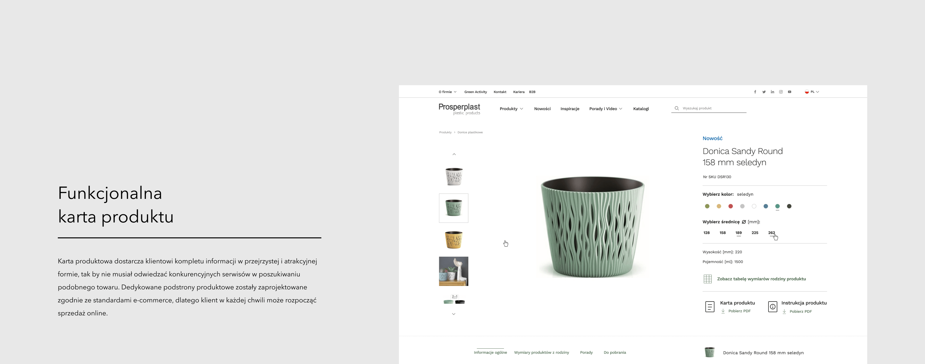 Nowoczesna i przejrzysta karta produktowa umożliwia komfortowe przeglądanie bogatego asortymentu, a funkcja filtrowania produktów ułatwia szybkie i intuicyjne odnalezienie pożądanego towaru. Na kartach umieściliśmy rozbudowane dane produktowe, by zoptymalizować proces zakupowy i ułatwić klientom Prosperplast podjęcie decyzji. Podstrony zostały zaprojektowane zgodnie z trendami e-commerce oraz zasadami SEO, dlatego w każdej chwili nasz klient może rozpocząć skuteczną sprzedaż online, skierowaną zarówno do B2B, jak i B2C.