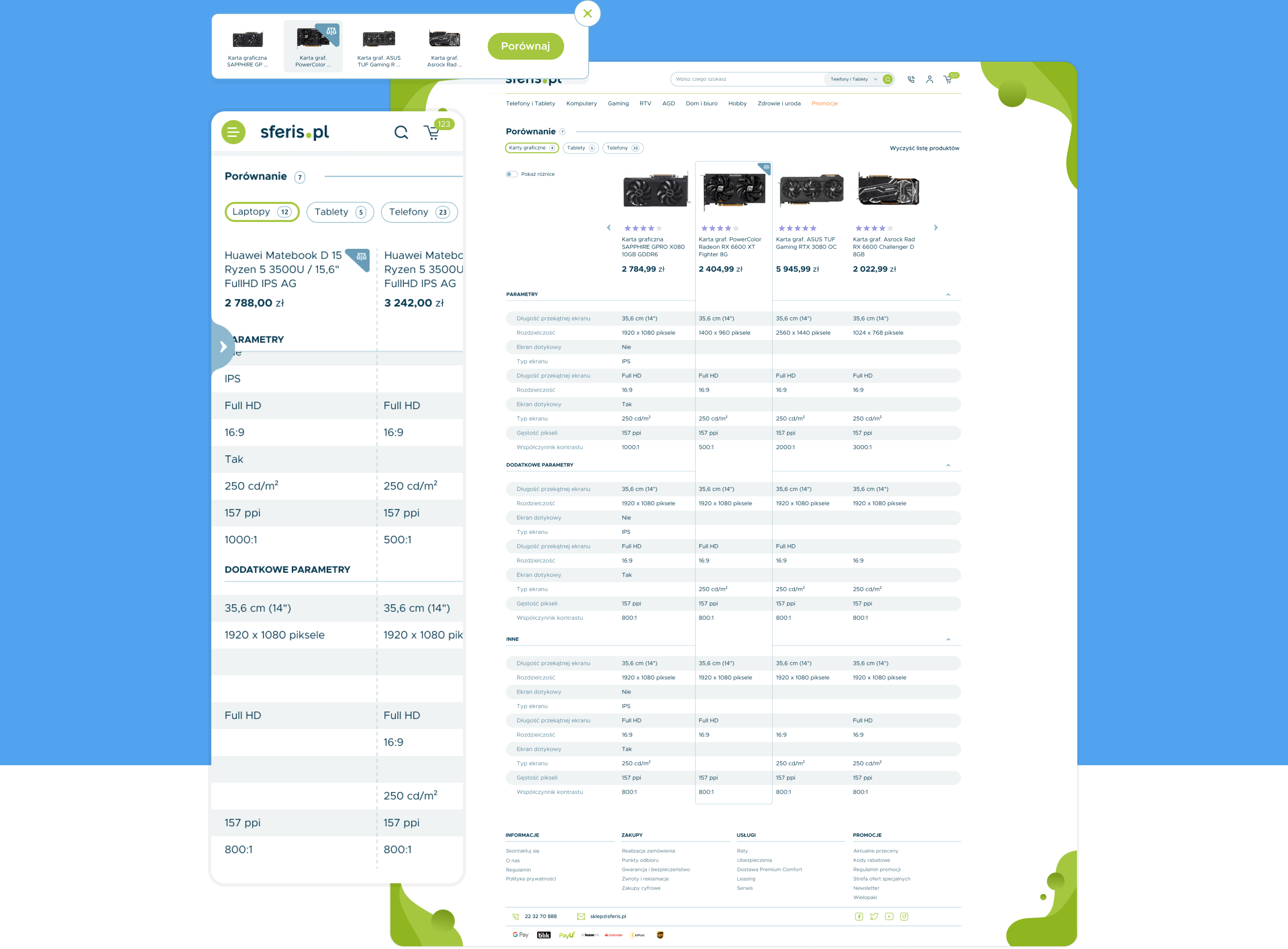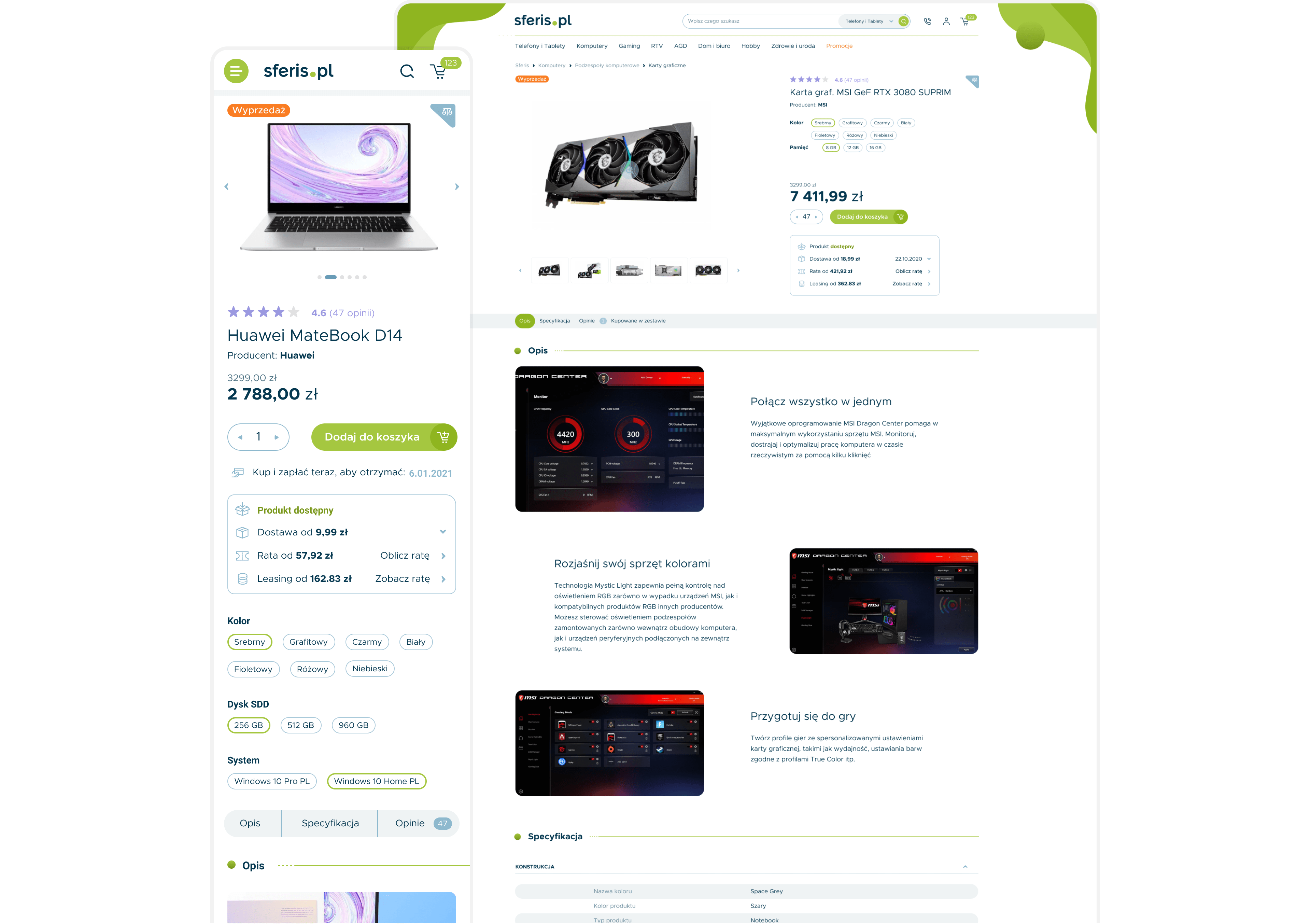 Sferis to firma, która posiada w swojej ofercie bardzo dużo produktów – z różnych kategorii – a każdy z nich występuje w kilku wariantach. Stworzyliśmy system trzech, dedykowanych, responsywnych widoków produktów. Zawiera on specjalny układ tagów, które pozwalają na oznaczenie produktów wg różnych kryteriów – nazwy promocji, rabatu, kategorii itp. Parametry danego produktu występują w “podtytule”, dzięki czemu sama nazwa produktu jest krótka i czytelna. Wszystkie parametry produktu widoczne są i możliwe do zmiany na stronie danego artykułu.