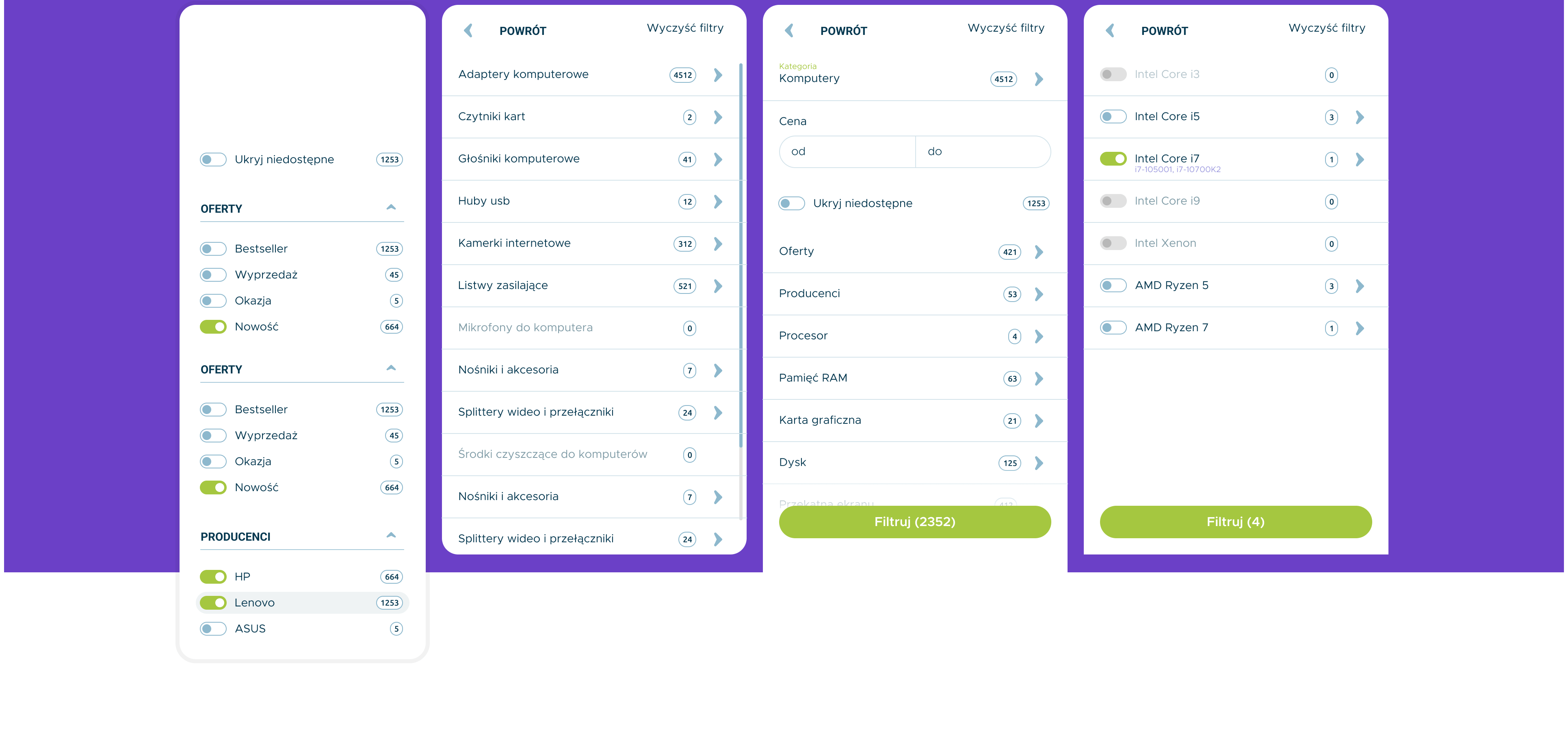 Obecne filtrowanie produktów w sklepie zostało dostosowane do strategii sprzedażowej. Zostało zbudowane w sposób przejrzysty, dynamiczny, intuicyjny. Ten element sklepu został także dostosowany do wersji mobilnej. Aby usprawnić filtrowanie i sortowanie zastosowaliśmy nowe interakcje (np. switch zamiast checkboxa) dopasowane do dynamicznego szukania produktów.