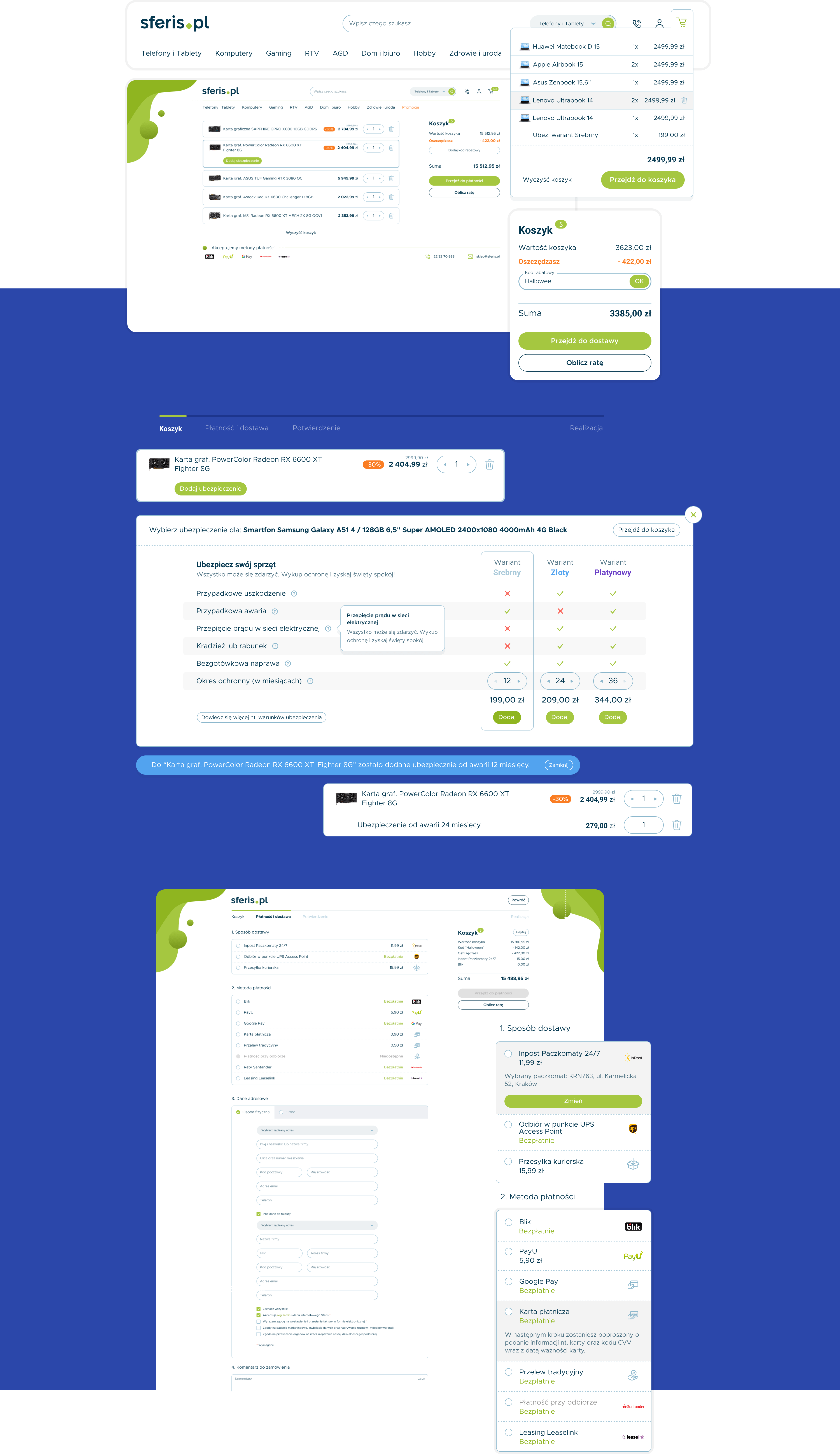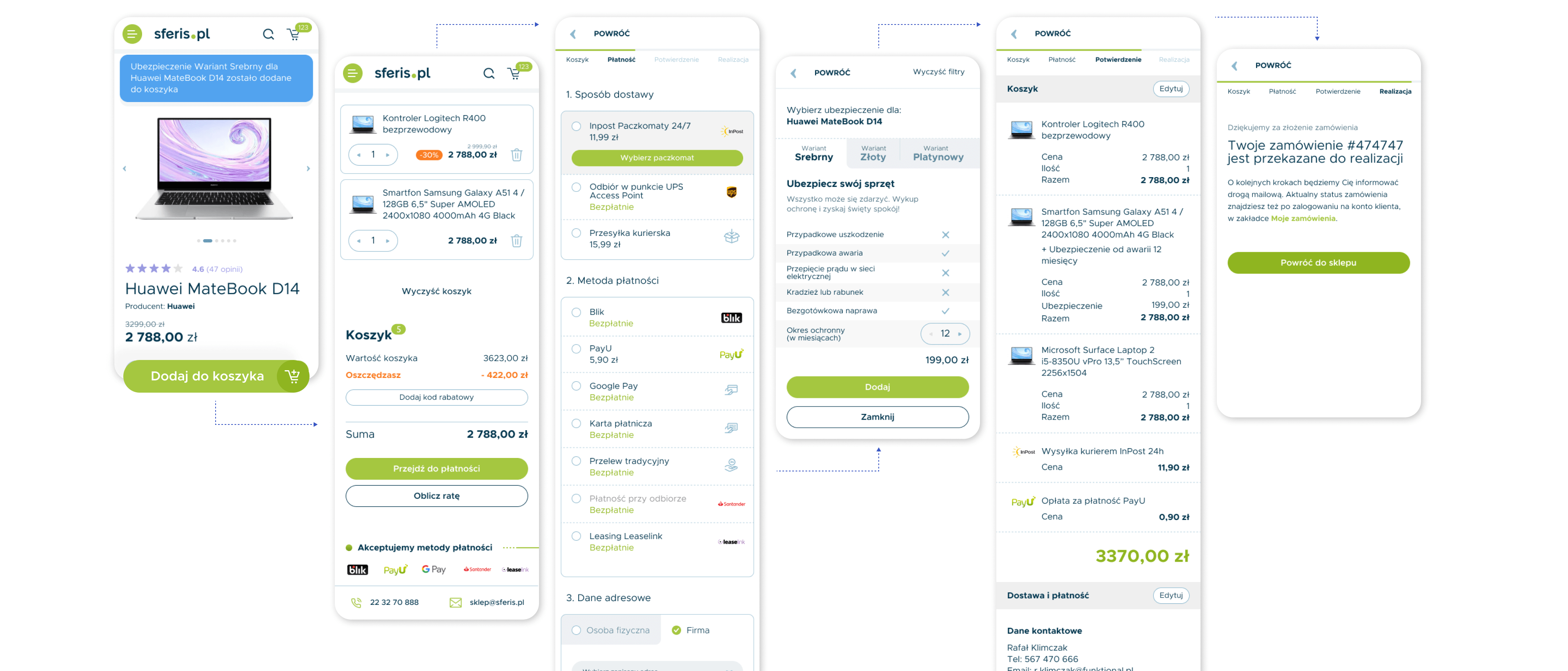 Nowy sklep Sferis.pl to zupełnie nowy proces zakupowy. Zaprojektowaliśmy nowy widok podsumowania zamówienia, w którym każdy krok zakupowy jest przejrzysty i maksymalnie uproszczony. Zastosowaliśmy dynamiczne podsumowanie zamówienia, które w sposób rzeczywisty aktualizuje informacje odnośnie zakupów.