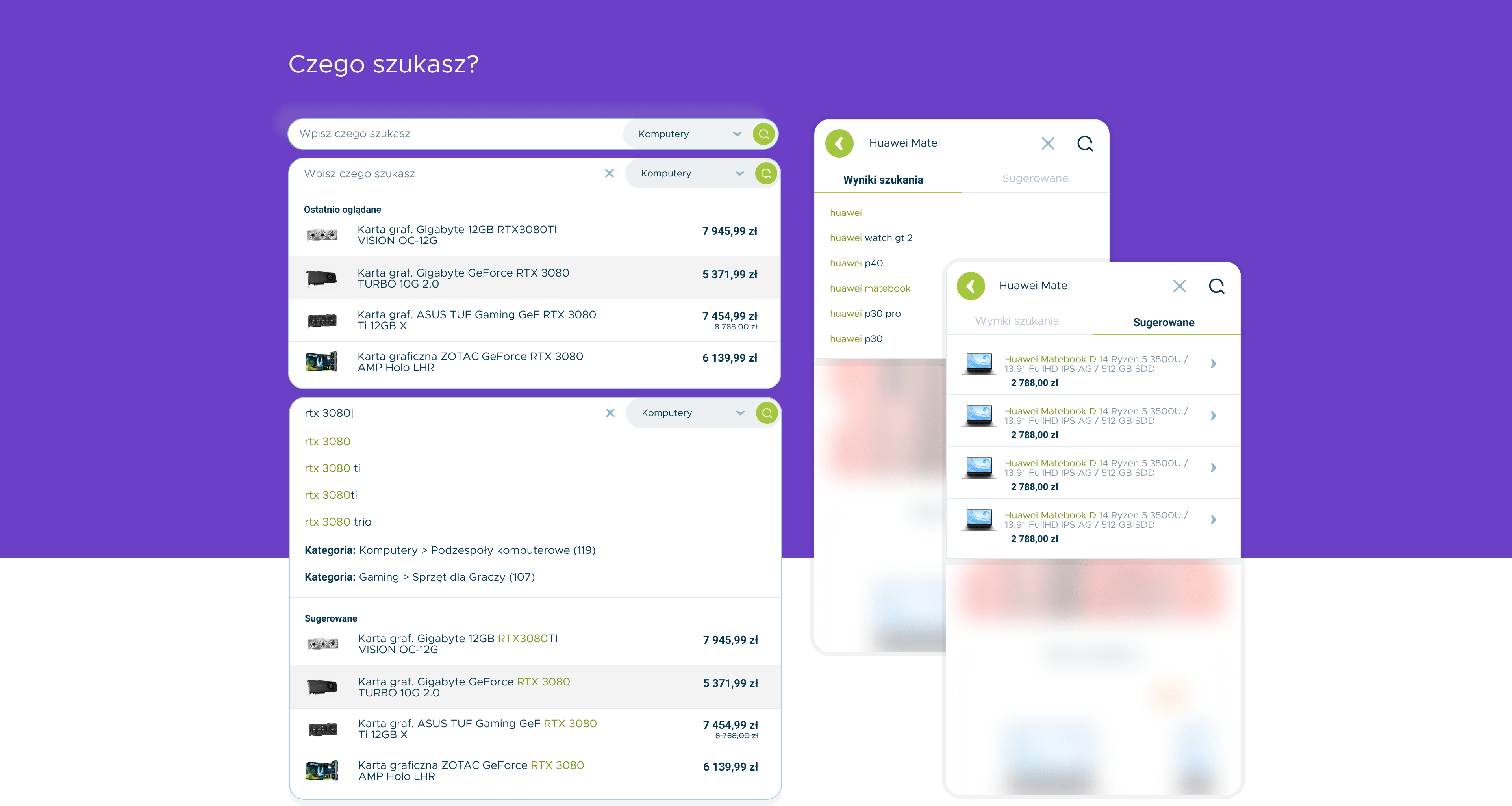 Wyszukiwanie produktów zaprojektowaliśmy tak, aby było ono intuicyjne na każdym etapie zakupowym, z każdego miejsca w sklepie. Nowy e-commerce umożliwia nam konfigurowanie zapytania w jednym miejscu – otrzymując na bieżąco sugestie odnośnie ostatnio oglądanych produktów, słów kluczowych oraz produktów podobnych. To rozwiązanie, które dopasowaliśmy indywidualnie do wersji desktopowej i mobilnej.