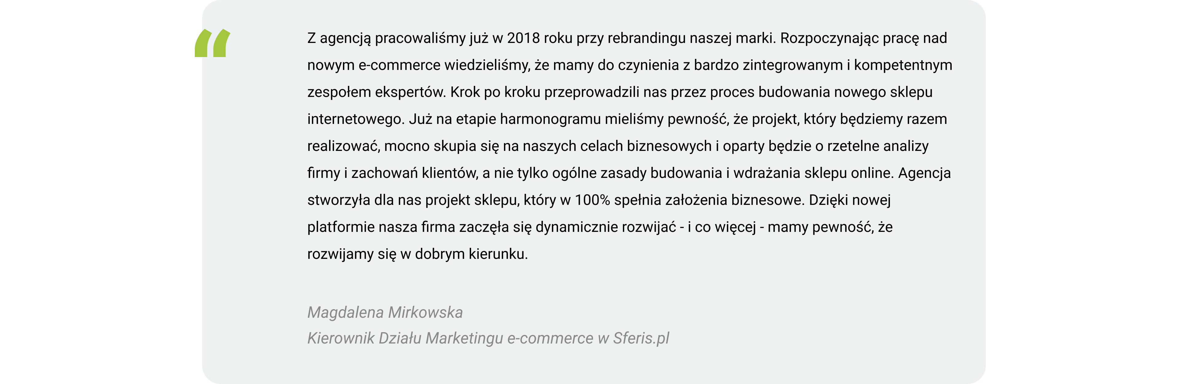 W ramach wcześniejszej współpracy z marką Sferis.pl stworzyliśmy nową strategię komunikacji i identyfikację wizualną, która stawiała na bardzo emocjonalny przekaz i budowanie zaangażowania i relacji z kupującymi. Niebanalne motywy graficzne, zunifikowana typografia, a także nowoczesna paleta kolorystyczna wspólnie stworzyły wizerunek i nadały marce tożsamość, która była punktem wyjściowym i istotnym kierunkiem dla dalszych prac.
